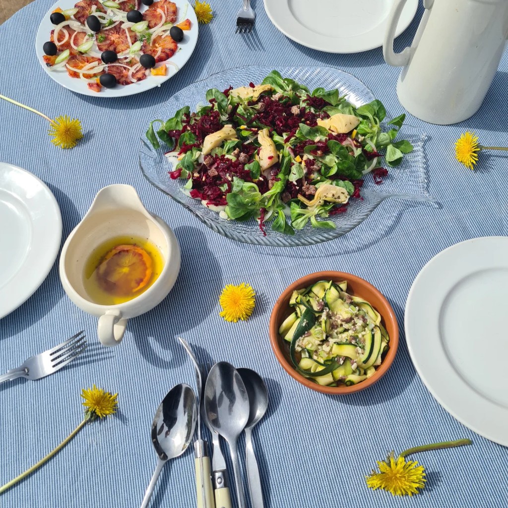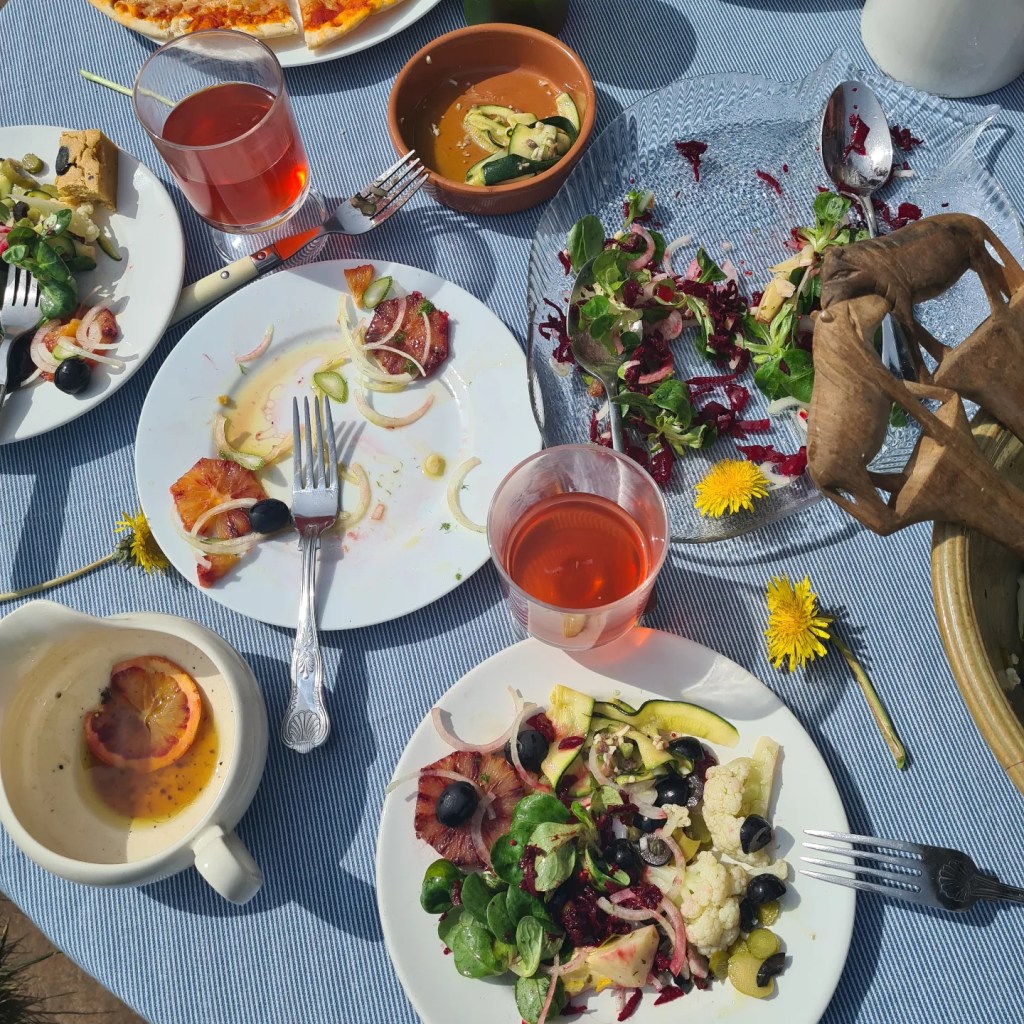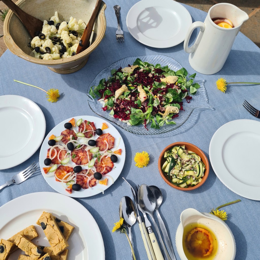 A feast to celebrate Spring and the first Sunday lunch in the sunshine of 2022. An assortment of salads, chickpea bread, goat milk panna cotta and a hibiscus water kefir.