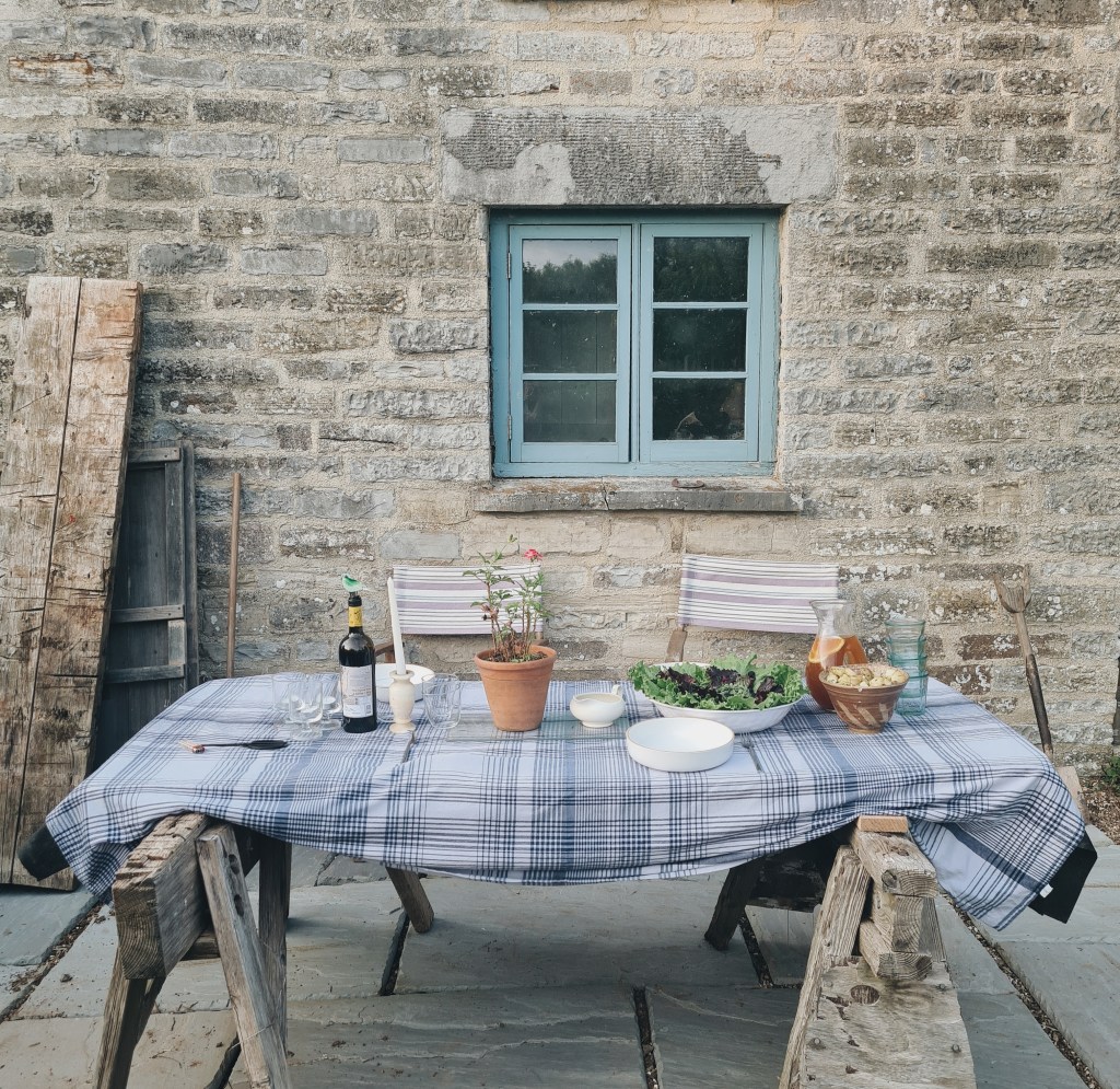 A table was fashioned from some old trestles and a door was used to make a make shift tabletop. We positioned our contraption in the exact spot outside the house where you can watch the sun go down.