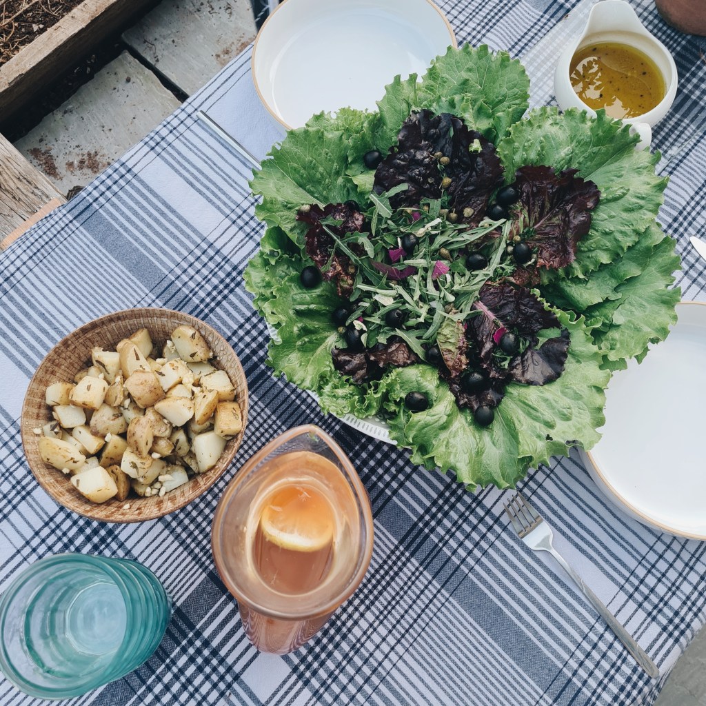 I picked the biggest lettuce leaves I could find from the garden and we feasted on a big garden salad with a live dressing, potatoes fried in rosemary, a big shakshuka and toasted the evening with elderflower and lemon kombucha.