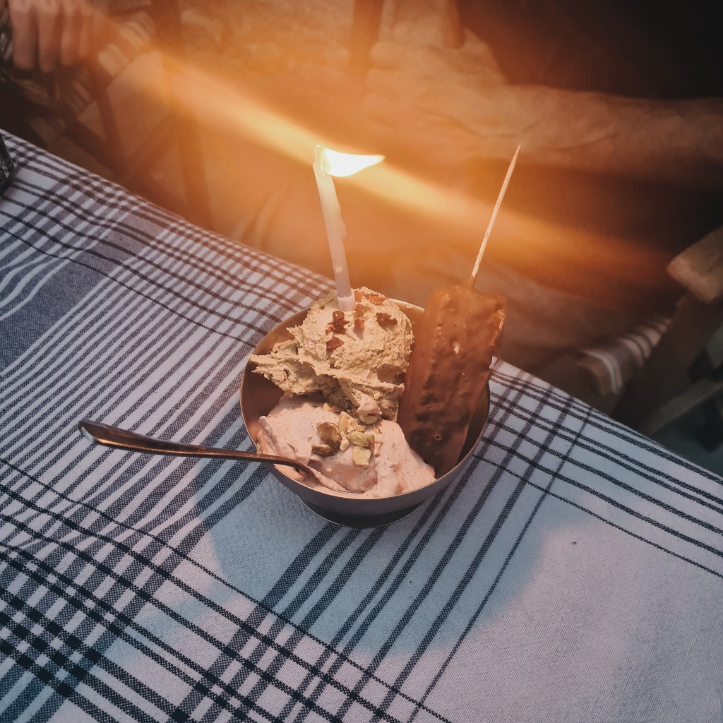 Dessert was homemade matcha ice cream with chunky homemade bounty bars for flakes.
