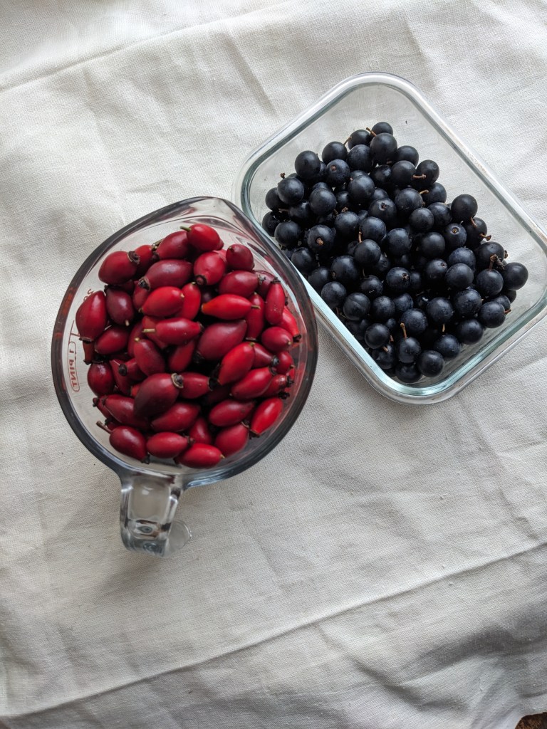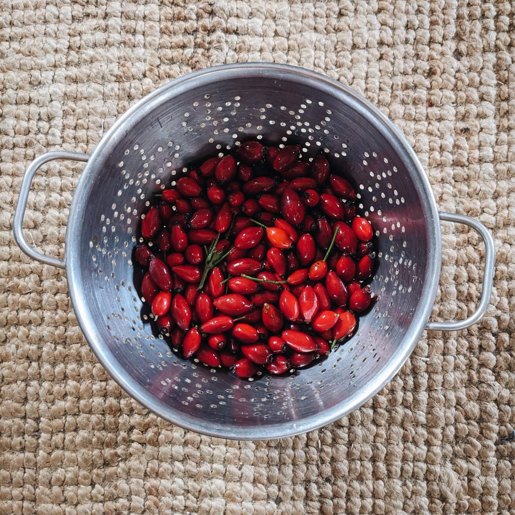 - A container of foraged rosehips