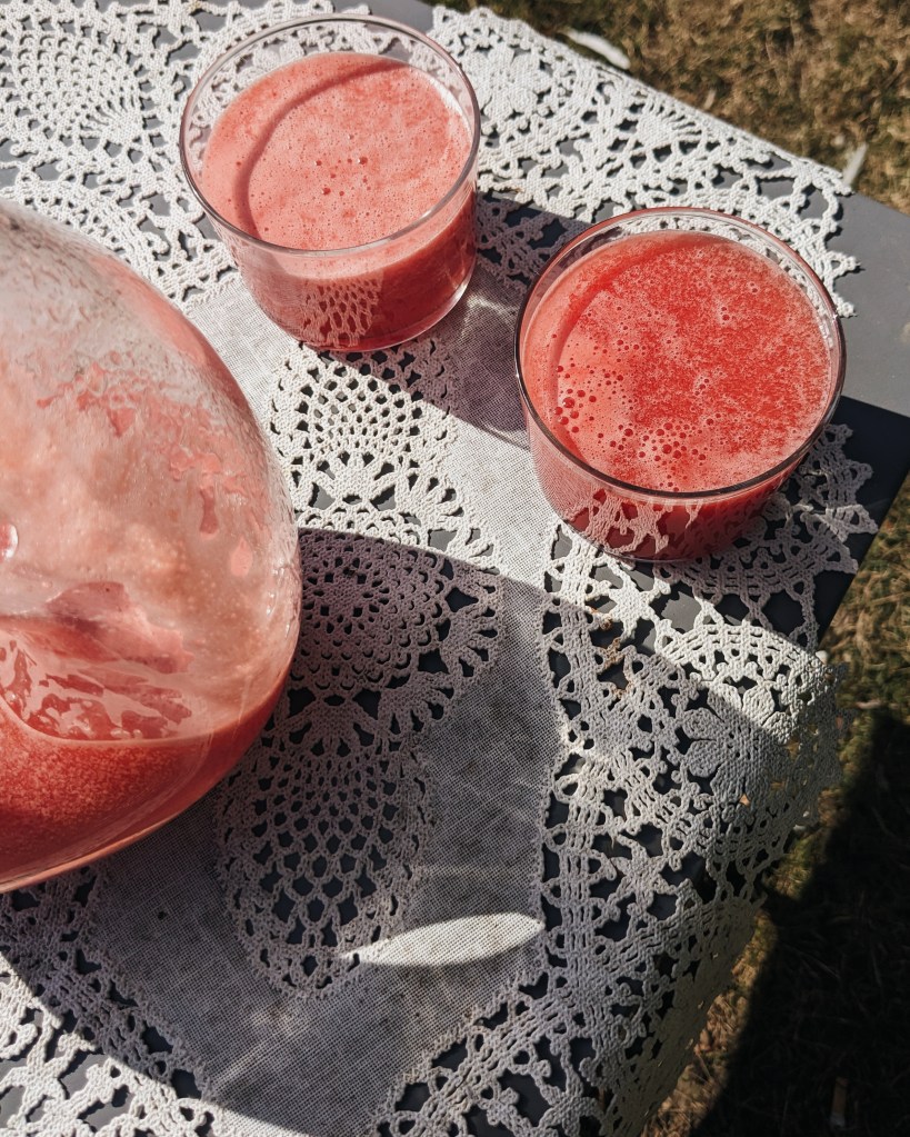 A fermented drink to serve at golden hour in pretty glasses. A summertime twist on classic kombucha with the added fun of serving it out of the melon itself.
